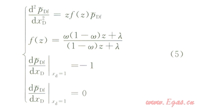 式中z為與滲流數(shù)學(xué)模型無(wú)因次時(shí)間相對(duì)應(yīng)的拉普拉斯空間自變量;`RDF為拉普拉斯空間中儲(chǔ)層裂縫系統(tǒng)無(wú)因次壓力;w為裂縫—孔隙雙重介質(zhì)儲(chǔ)層的儲(chǔ)容比,無(wú)因次;l為裂縫—孔隙雙重介質(zhì)儲(chǔ)層的竄流系數(shù),無(wú)因次;f(z)為綜合描述裂縫系統(tǒng)和孔隙系統(tǒng)儲(chǔ)滲級(jí)差關(guān)系的函數(shù)值,無(wú)因次;xD如為研究單向線(xiàn)性滲流問(wèn)題的一維坐標(biāo)系中無(wú)因次坐標(biāo)值,設(shè)定氣水區(qū)交界處xD=0,水區(qū)外邊界處xD=l。