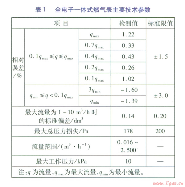 全電子一體式燃?xì)獗硗ㄟ^了無錫市計(jì)量測試中心對(duì)精確度、重復(fù)性、總壓力損失的檢測,取得了校準(zhǔn)證書。因目前沒有相應(yīng)的標(biāo)準(zhǔn),只能參照膜式燃?xì)獗淼臉?biāo)準(zhǔn),其技術(shù)指標(biāo)均達(dá)到GB/T6968-2011《膜式燃?xì)獗怼?span lang="EN-US">1.5級(jí)表的要求,主要技術(shù)參數(shù)見表l。