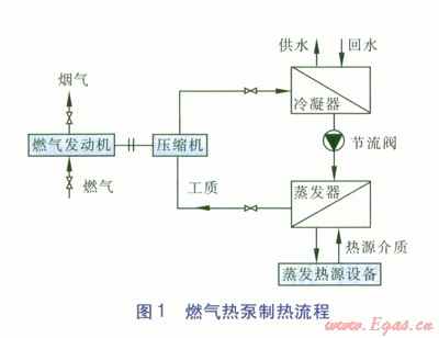燃煤鍋爐和燃天然氣鍋爐供熱均為直接燃燒供熱,燃煤鍋爐制熟效率取80%,天然氣鍋爐制熱效率取85%。熱泵供熱是利用逆卡諾循環(huán)的原理將低品位的熱能提升到供暖熱水的溫度而進行制熱。燃氣熱泵制熱時,壓縮機靠燃氣發(fā)動機驅(qū)動,其流程見圖l。電動熱泵制熱時,壓縮機采用電動機驅(qū)動。