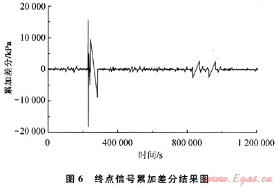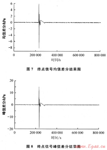從上面對音波信號的時域和頻域分析中可以看出,信號的幅值和功率譜密度是可以作為泄漏判斷的特征量的,這驗證了1.1節(jié)的分析結(jié)果。除此之外,1.1節(jié)提出的相鄰區(qū)間信號累加差分、均值差分、峰值差分的特征識別方法,也可以作為泄漏檢測的判斷依據(jù)。當(dāng)管道起點壓力為4.6MPa左右,泄漏孔徑為0.45mm時,將泄漏點1發(fā)生泄漏時采集到的測試管段終點的聲壓進行去噪,根據(jù)提出的相鄰區(qū)間信號累加差分、均值差分、峰值差分的算法,可分別得到終點信號累加差分結(jié)果如圖6所示,終點信號均值差分結(jié)果如圖7所示,終點信號峰值差分結(jié)果如圖8所示。