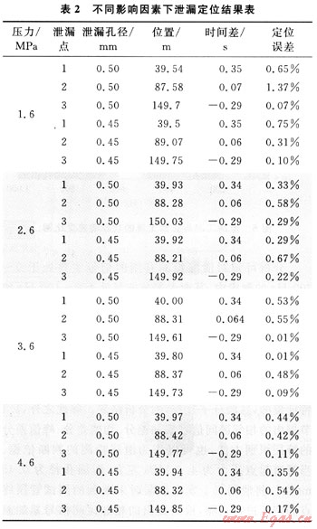 泄漏定位試驗是與泄漏檢測試驗一起進行的,運用泄漏檢測采集到的數(shù)據(jù),分析在不同泄漏工況下音波法泄漏定位的適用性及定位誤差。不同影響因素下泄漏定位結(jié)果如表2所示。