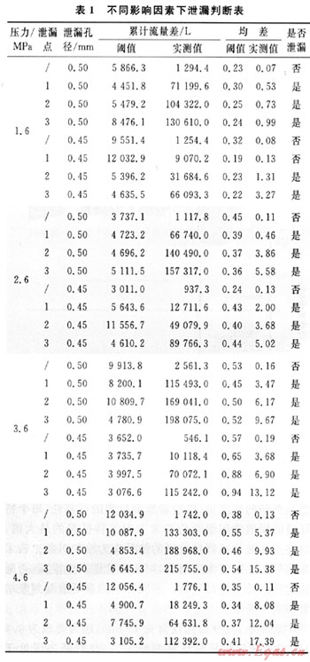 表1中,在泄漏孔徑為0.45mm,壓力等級為1.6MPa時,泄漏信號特征量判斷失誤,此判斷失誤處于泄漏孔徑較小,壓力等級較低的工況,通過調(diào)節(jié)動態(tài)閾值及其權(quán)值,可以防止此類事情的發(fā)生。