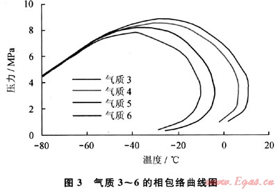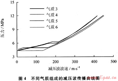 圖3為氣質(zhì)3~6的相包絡(luò)曲線圖,由表2和圖3可知,從氣質(zhì)3到氣質(zhì)6,氣質(zhì)組成逐漸變“輕”,其相包絡(luò)曲線的氣液兩相區(qū)域逐漸變小。圖4為不同氣質(zhì)組成的減壓波傳播曲線,初始壓力為12MPa,溫度為30℃。由圖4可知,各曲線出現(xiàn)“平臺”的壓力逐漸降低,“平臺”位置下降。由此可以推測,若氣質(zhì)組成中重組分含量減少至某程度時,減壓波曲線中的平臺將消失,變?yōu)橐粭l光滑的曲線。也就是說,隨著重組分含量的增加,減壓波曲線容易進入兩相區(qū),壓力保持在高位不能迅速下降,增大了管道裂紋擴展的風(fēng)險。