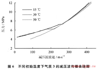 溫度是影響氣體特性的一個重要因素,對相態(tài)的影響尤為明顯。因此,以表2中氣質(zhì)3為例進行分析。采用Decomwave軟件計算了在初始壓力為12MPa時,在不同初始溫度(15℃、30℃、50℃)下的減壓波波速,結(jié)果如圖6所示。