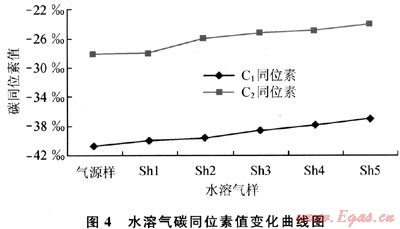 2) 通過甲烷在解吸吸附過程中碳同位素的分餾效應(yīng),可以判斷煤層氣成藏過程。在煤層氣開發(fā)過程中,可以建立某一區(qū)塊煤層氣開發(fā)井的甲烷碳同位素值的標(biāo)準(zhǔn)變化曲線,從而根據(jù)開發(fā)井甲烷碳同位素的值來判斷煤層氣井的開發(fā)狀態(tài)及采收率。