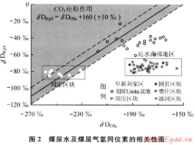 煤層水及煤層氣氫同位素的相關(guān)性表明:阜新劉家地區(qū)煤層生物成因氣偏向C02還原作用,沁水盆地南部煤層生物成因氣偏向發(fā)酵作用(圖2,分析中采用國際標(biāo)準(zhǔn)物質(zhì)VSMOW):