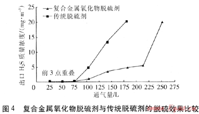 將改進(jìn)后的脫硫劑與傳統(tǒng)工藝生產(chǎn)的脫硫劑在同樣的實(shí)驗(yàn)條件下,進(jìn)行了比較,結(jié)果見(jiàn)圖4。實(shí)驗(yàn)條件為:反應(yīng)器直徑為8mm,長(zhǎng)度為33cm,脫硫劑粒度為420~840μm目,裝填質(zhì)量為5g,流速為1.0L/min,空間速度為9000h一左右;試驗(yàn)氣體為硫化氫和氮?dú)獾幕旌蠚怏w;進(jìn)口硫化氫質(zhì)量濃度為1.0g/m3,硫容穿透標(biāo)準(zhǔn)為出口硫化氫質(zhì)量濃度>20mg/m3。從圖4可以看出,在上述實(shí)驗(yàn)條件下,傳統(tǒng)工藝生產(chǎn)的脫硫劑通氣量為180L就穿透;而改進(jìn)后的脫硫劑通氣量可達(dá)250L才穿透。因此,改進(jìn)后的新型城市煤氣復(fù)合金屬氧化物脫硫劑比傳統(tǒng)工藝生產(chǎn)的脫硫劑的脫硫效果好。