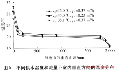 在不同供水溫度和流量下,室內(nèi)垂直方向溫度分布見圖5。由圖5可知:①隨著高度的增加,空氣溫度迅速降低,在距地面200mm處溫度基本達到穩(wěn)定,而在距地面1800mm以上溫度迅速降低。②隨著供水流量的增大與供水溫度的升高,各測點溫度也相應升高,且在地面附近溫度差異明顯,在頂棚附近溫度沒有明顯變化。這種現(xiàn)象反映r熱管地板輻射采暖與普通地板輻射采暖的特點一致,即室內(nèi)空氣垂直方向溫度梯度小。