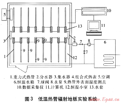 碳鋼/水重力式熱管(又稱碳鋼/水兩相閉式熱虹吸管)具有結構簡單、成本低廉、傳熱性能優(yōu)良、工作可靠等特點,在冶金、化工、建材、動力等行業(yè)有很多成功的應用實例[1]。隨著熱管技術的不斷成熟,其在建筑行業(yè)的應用引起了學者們的關注。JEBRAIL等制作了熱管散熱器并測試了其熱工性能[2],國內(nèi)學者蔣愛華等對熱管輻射墻壁進行了探討[3],羅清海等分析了不同工質(zhì)熱管散熱器的熱工性能[4]。本文擬將碳鋼/水重力式熱管與地板輻射采暖系統(tǒng)結合起來,以期利用其優(yōu)良的傳熱性能,在提供舒適熱環(huán)境的同時,達到降低供水溫度、減小熱水循環(huán)流量、提高系統(tǒng)整體運行效率和經(jīng)濟性的目的。本文在重力式熱管和串聯(lián)熱管傳熱性能研究的基礎上[5],對低溫熱管輻射地板的熱工性能進行實驗研究。