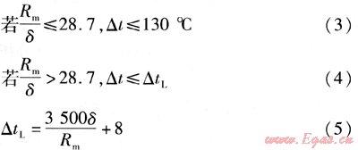 方法2將臨界徑厚比放寬到Rm/δ<40.1,相應壁厚減薄,按方法1核算的極限溫差結果不能滿足最大循環(huán)溫差(120℃)要求,但差值不是很大。