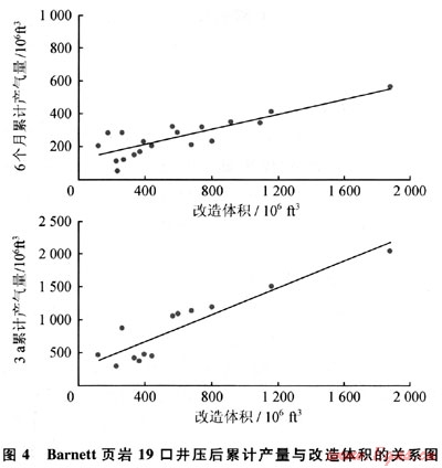 在Barnett頁(yè)巖19口有井下微地震監(jiān)測(cè)資料的井,改造后的體積與壓后6個(gè)月和3a累計(jì)產(chǎn)量的比較曲線見(jiàn)圖4。由圖4可見(jiàn):19口井的壓裂改造體積在5.3×106~52.7×106m3,且壓后4個(gè)月的累計(jì)產(chǎn)量隨著改造體積的增加而增加,壓后3a增加的幅度更大,這充分說(shuō)明改造體積對(duì)頁(yè)巖氣壓后產(chǎn)量的重要作用。