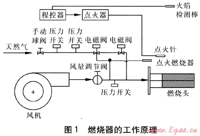 為了滿足實際應用的需要,選用比例閥控制及燃燒控制系統(tǒng),使其具備預吹掃、自動點火、火焰檢測、熄火保護報警、燃氣高低壓保護、風機故障保護、負荷可調等功能。燃燒器的工作原理見圖1。