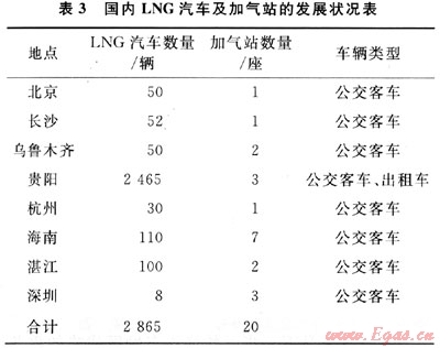 目前國(guó)內(nèi)只有北京、烏魯木齊、長(zhǎng)沙、貴陽(yáng)、海南等城市和地區(qū)進(jìn)行了LNG汽車技術(shù)示范應(yīng)用,并主要局限在公交車領(lǐng)域的應(yīng)用。據(jù)調(diào)查,截止到2009年12月全國(guó)僅有2800余輛LNG汽車運(yùn)行,已建成的部分LNG加氣站情況如表3所示。