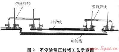 由于停氣實施新老管線對接對下游用戶影響較大,建設單位要求該段管線采用不停輸方式進行封堵連頭。由于改造段管線兩側封堵施工點距離長達700m,敷設長距離旁通管既不經濟又費時間。因此決定采用在舊管線兩端對接點分別架設旁通的帶壓封堵工藝,其工藝示意圖如圖2所示。此工藝的優(yōu)點在于無須架設長距離旁通管道,所有工序均在不影響管線內高壓介質正常輸送的狀態(tài)下進行,安全可靠[1]。
