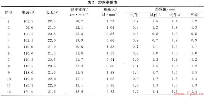 試驗步驟:試件放置在水平位置,分別調節(jié)電流到100A、110A、120A進行焊接。將焊接試件剖開,表面進行加工后,磨制成金相試件,然后拋光、腐蝕,測定最大熔深和平均熔深,數據見表2。