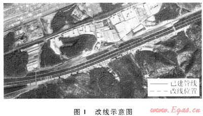 深圳市擬建的地鐵5號線塘朗段與平南鐵路用地沖突,平南鐵路須向南平移。但鐵路平移將與廣東LNG塘朗段管道發(fā)生沖突,為保證LNG管道的安全運行、周邊在建各項目的正常施工及建成后的安全,深圳市政府及有關方面要求對該段管道進行遷移。該段管線為廣東LNG支干線的一部分,主要向深圳工業(yè)及民用用戶供氣,已于2006年竣工并投運。管道設計壓力為9.2MPa,規(guī)格為Φ610mm×12.7mm,材質為X65鋼,需改線遷移的管道長720m。鑒于經濟和社會影響,改線管道建成后,需與舊管線實施不停輸帶壓對接。改線示意圖見圖1。