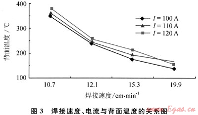試驗步驟:將試件放置在水平位置,分別調節(jié)電流到100A、110A、120A,進行焊接,測量背面溫度,數據見表1。焊接速度、電流與背面溫度的關系如圖3所示。