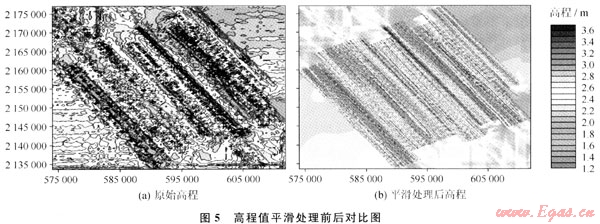 在室內(nèi)處理中使用SkyFix XP定位系統(tǒng)測(cè)量地震采集過(guò)程中地震船實(shí)時(shí)的大地高程,然后通過(guò)高程轉(zhuǎn)換,計(jì)算出地震采集過(guò)程中實(shí)時(shí)的潮汐值。利用SkyFix XP高程進(jìn)行潮汐校正,需要進(jìn)行高程值平滑處理,消除各種偶然誤差帶來(lái)的對(duì)高程的跳變影響。從圖5中可以看出各航行線之間高程的明顯變化,同時(shí)也反映了由于潮汐變化使地震采集不是在一個(gè)固定平面上進(jìn)行的事實(shí)。