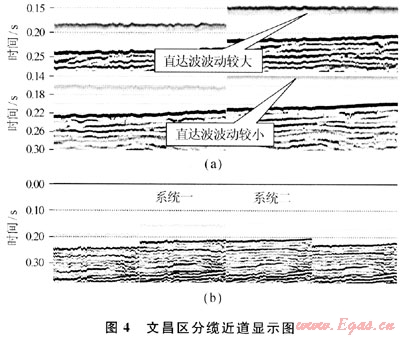 除了海底的問(wèn)題外,近遠(yuǎn)纜的空間分布的位置及地下介質(zhì)的吸收系數(shù)、反射系數(shù)不同,會(huì)使得不同電纜接受的反射信號(hào)存在著差異。所以認(rèn)為,近遠(yuǎn)纜接受信號(hào)的差異是海上地震資料采集腳印嚴(yán)重的重要原因之一。在文昌區(qū)某些早期采集的地震數(shù)據(jù)中,不同線之間的采集質(zhì)量差異較大(圖4-b)。從直達(dá)波可以看出圖4-a上中直達(dá)波波動(dòng)較大,說(shuō)明采集時(shí)所受外界影響大,質(zhì)量較差;而圖4-a下中直達(dá)波波動(dòng)較小,說(shuō)明采集時(shí)所受外界影響小,質(zhì)量較好。特別在文昌區(qū)中地震數(shù)據(jù)采集時(shí)有兩個(gè)記錄系統(tǒng),兩個(gè)系統(tǒng)之間的不穩(wěn)定帶來(lái)采集腳印的影響非常嚴(yán)重,系統(tǒng)二采集質(zhì)量較好,系統(tǒng)一遠(yuǎn)纜采集質(zhì)量較差。以上原因也是導(dǎo)致該工區(qū)的采集腳印非常嚴(yán)重的另一個(gè)原因。