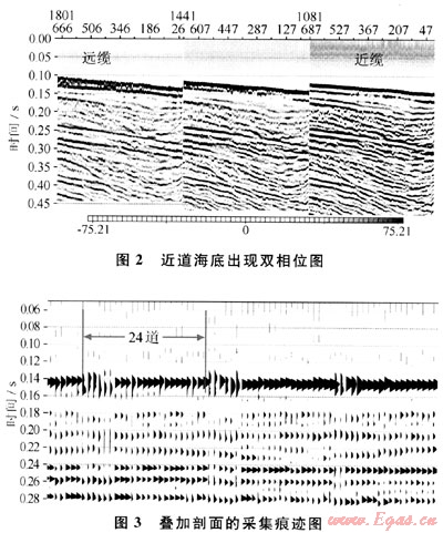 在海上三維采集中,由于海上拖纜特殊的采集方式,觀測(cè)系統(tǒng)因素除了陸上采集的觀測(cè)系統(tǒng)因素(激發(fā)和接收線距、寬方位和窄方位、覆蓋次數(shù)、方位角、炮檢距和源致線性干擾)外,還有因震源、電纜檢波點(diǎn)位置都處于相對(duì)運(yùn)動(dòng)狀態(tài)而帶來(lái)的其獨(dú)特影響。非觀測(cè)系統(tǒng)因素則包括了潮汐、水溫、含鹽度、水流方向、洋流、風(fēng)力、采集工區(qū)的水深、氣槍容量、氣槍壓力的變化、工區(qū)的地質(zhì)條件以及出于經(jīng)濟(jì)方面的考慮海上拖纜采集以轉(zhuǎn)圈的采集方式等多方面的影響。在對(duì)文昌區(qū)數(shù)據(jù)進(jìn)行檢查與分析時(shí),通過(guò)逐纜抽取地震數(shù)據(jù)近道檢查可以看到,通常遠(yuǎn)纜采集質(zhì)量較差,而且接收到的能量與近纜是有差異的。局部區(qū)域在遠(yuǎn)纜近道顯示上的海底甚至出現(xiàn)雙相位(圖2),造成疊加數(shù)據(jù)體每隔24道(與處理面元有關(guān))海底成像不好出現(xiàn)嚴(yán)重的采集痕跡(圖3)。經(jīng)分析,這種現(xiàn)象受水深及采集時(shí)的最小偏移距的共同影響,在水深100m左右的工區(qū)中這種遠(yuǎn)纜出現(xiàn)雙相位的現(xiàn)象特別明顯,而水深超過(guò)120m后遠(yuǎn)纜出現(xiàn)雙相位的情況就沒(méi)有那么明顯了,在水深小于50m時(shí),地震數(shù)據(jù)體的海底基本上不成像。