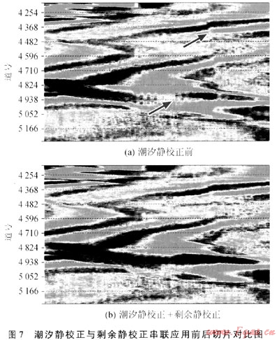 地震資料處理中,利用SkyFix XP進(jìn)行潮汐校正后,在一定程度上提高了地震資料的分辨率,地震資料有了明顯的改善,減輕了采集腳印,消除了在CDP方向可能出現(xiàn)的“垂直斷層”現(xiàn)象。