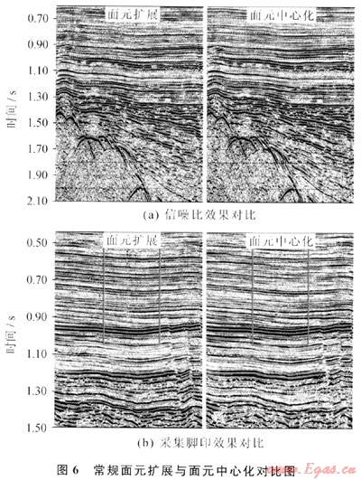 從圖6-a上看采用面元中心化后疊加信噪比有明顯的提高。圖6-b中顯示面元中心化與面元擴(kuò)展對(duì)比,采集腳印得到了一定衰減。