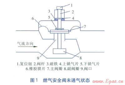 如圖l所示,此型號燃?xì)獍踩y在未通氣狀態(tài)下,閥瓣在重力作用下下落,磁鐵3吸附上鎖氣片4,主閥瓣7關(guān)閉閥口9,燃?xì)獍踩y處于切斷狀態(tài)。當(dāng)燃?xì)獍踩y通氣后,若不上提復(fù)位鈕進(jìn)行手動(dòng)復(fù)位,燃?xì)獍踩y進(jìn)睜壓力無法克服磁鐵3吸附上鎖氣片4的磁力作用,燃?xì)獍踩y將一直處于如圖l所示的切斷狀態(tài)。