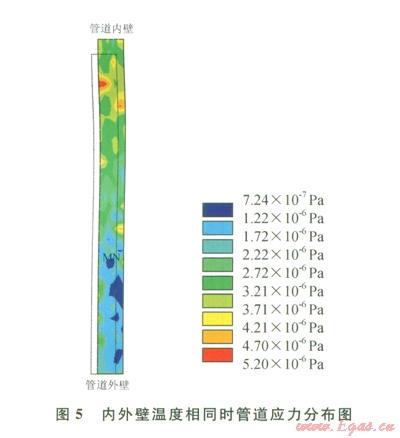 由計(jì)算可知,在x軸處有固定墩約束軸向位移,管道無(wú)內(nèi)外壓作用,管道外壁熱量損耗,較內(nèi)壁溫差不大時(shí)(圖4),管道內(nèi)壁溫度為氣體溫度50℃,熱量由內(nèi)壁沿徑向均勻分布于外壁,因此,在內(nèi)外壁產(chǎn)生了不均勻的熱應(yīng)力。當(dāng)內(nèi)外壁溫度相同、沒(méi)有溫差影響時(shí)管道內(nèi)壁(圖5),管道內(nèi)外壁溫度為50℃。在一端固定墩的約束下,管道應(yīng)力分布極不均勻,軸向伸長(zhǎng)量達(dá)到0.019mm,這是由于溫度影響產(chǎn)生的熱脹冷縮效應(yīng),管道增加的應(yīng)力經(jīng)過(guò)軸向的伸長(zhǎng)補(bǔ)償,減小了應(yīng)力集中分布的趨勢(shì),從而在軸向產(chǎn)生了較大的位移。