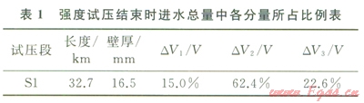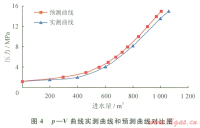 同時(shí),分析預(yù)測曲線中V的組成,其中DV1、DV2、DV3各自所占的比例見表l,由水壓縮性計(jì)算而得的DV3,其值超過DV1,是試壓進(jìn)水量的一個(gè)重要因素,不可在計(jì)算中忽略。