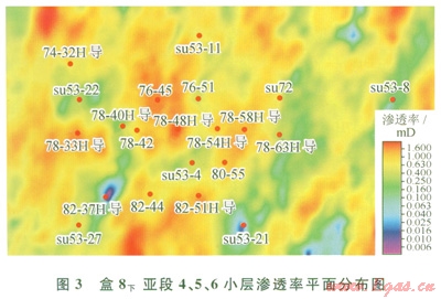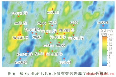 在有效厚度三維模型的基礎上,提取了各小層有效厚度的疊合圖,形成盒8下亞段4、5、6小層的有效厚度疊合圖(圖6),從平面上反映r有效儲層的分布范圍和趨勢。通過地質建模預測盒8下亞段4、5、6小層累計有效砂巖厚度為0~22m,基本呈連片分布,與沉積特征相一致,該區(qū)中部、南部及西部的78-33H導井區(qū)有效厚度最大,達到20m左右;低值區(qū)主要分布在蘇53-7井東部、82-37H導井區(qū)、蘇53-8井區(qū)附近等,有效厚度小于3m,反映了區(qū)內氣藏的分布規(guī)律。