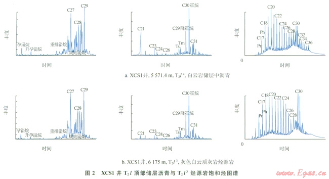 1)氣源分析發(fā)現(xiàn),川西坳陷T2l頂部風(fēng)化殼氣藏氣源主要來自于T2l渦湖相的“富藻碳酸鹽巖烴源巖”:CKl井3個(gè)氣樣分析結(jié)果顯示,T2l滅然氣中含H2S,(H2S含量介于0.39%~0.68%),天然氣碳同位素值有別于陸相上三疊統(tǒng)須家河組和侏羅系,表現(xiàn)出典型的油型氣特征;同時(shí),XCSl井T2l頂部儲(chǔ)層瀝青與蒸發(fā)巖之下“富藻碳酸鹽巖烴源巖”生物標(biāo)記化合物特征表現(xiàn)出很高的相似性,均具有低孕甾烷、規(guī)則甾烷呈“V”形、三環(huán)萜烷含量小于五環(huán)萜烷、色譜呈雙峰的特征(圖2)。