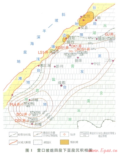 四川盆地海域在三疊紀(jì)雷口坡期(T2l)沉積時(shí)主要為陸表海斷續(xù)淹沒的蒸發(fā)臺(tái)地,由于受周邊造山帶構(gòu)造隆升、擠壓的影響,尤其受東南面江南古陸的隆升、臺(tái)內(nèi)瀘州—開江水下隆起形成的影響,該蒸發(fā)臺(tái)地內(nèi)形成次一級(jí)的隆凹,這些隆凹形成蒸發(fā)巖臺(tái)地內(nèi)渴湖、咸化鹽湖的基底。川西地區(qū)中三疊世雷口坡晚期膏鹽巖湖盆主要分布在邛崍—成都—德陽一帶(圖1),發(fā)育多套碳酸鹽巖、石膏、硬石膏巖及鹽巖的旋回沉積。
