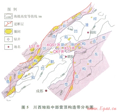地震資料解釋發(fā)現(xiàn)在川西坳陷的新場構(gòu)造帶、鴨子河隱伏構(gòu)造帶、坳陷東斜坡構(gòu)造帶內(nèi)雷口坡組構(gòu)造層還發(fā)育眾多次級(jí)構(gòu)造和層圈閉,構(gòu)造圈閉條件較好;另外,地震預(yù)測川西坳陷雷頂風(fēng)化殼有利儲(chǔ)層發(fā)育區(qū)面積達(dá)4000km2,遠(yuǎn)大于現(xiàn)今雷頂局部構(gòu)造圈閉面積的總和。因此雷頂風(fēng)化殼還具有存在巖性圈閉氣藏的可能。