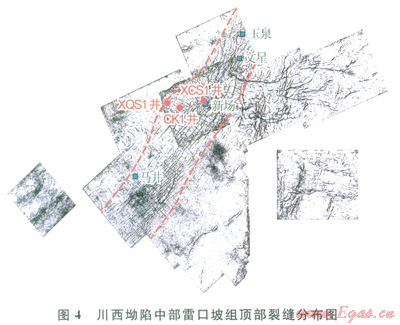 伴隨印支中晚期以來龍門山造山帶的隆升推覆、多期次由西向東強(qiáng)烈擠壓,使川西地區(qū)雷頂風(fēng)化殼層還受到了構(gòu)造裂縫及由構(gòu)造形變而產(chǎn)生的熱液流動(dòng)等因素的影響,重新形成在深埋條件下的“孔縫洞體系”。目前,在川西坳陷中部,用三維地震曲率法預(yù)測出在雷頂風(fēng)化面上明顯發(fā)育一組NE走向、寬約20km、長約75km、裂縫密度達(dá)22.33條/km2的網(wǎng)狀裂縫帶,裂縫向上延伸到小塘子組,向下延伸到雷四中下亞段,平面主要集中在文星、玉泉、新場、馬井一線(圖4)。分析認(rèn)為這組裂縫帶主要形成于印支晚期構(gòu)造運(yùn)動(dòng),裂縫帶發(fā)育與構(gòu)造形變及層內(nèi)膏鹽巖的塑性揉皺有關(guān),其可能對(duì)雷頂風(fēng)化殼巖溶儲(chǔ)層發(fā)育及溝通下伏層內(nèi)烴源起著十分重要的作用,CK1井和XCSl井發(fā)現(xiàn)的風(fēng)化殼氣藏都位于裂縫發(fā)育帶內(nèi)。