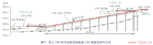 儲(chǔ)氣罐布置于岸上,安全可靠性強(qiáng);有現(xiàn)行國(guó)家規(guī)范作為設(shè)計(jì)、施工依據(jù);岸上LNG卸氣與船上LNG加氣可同時(shí)進(jìn)行,LNG加氣時(shí)間不受影響,充分滿足加氣船舶的需求;岸上LNG儲(chǔ)存設(shè)施可預(yù)留位置,加氣規(guī)模有發(fā)展余地;架空斜坡道長(zhǎng)度短,施工工期略短,對(duì)通航行洪影響小;造價(jià)較低。