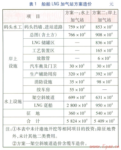 結(jié)合上述水上LNG加氣站方案、岸上LNG加氣站方案的建設(shè)內(nèi)容,對(duì)兩個(gè)方案進(jìn)行技術(shù)經(jīng)濟(jì)比較。船舶LNG加氣站方案造價(jià)見表1。