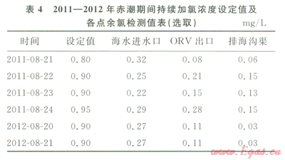 3)赤潮期間,由于海水對次氯酸的消耗增大,為保證有效氯水平,應(yīng)提高持續(xù)加氯濃度設(shè)定點為0.95mg/L左右。