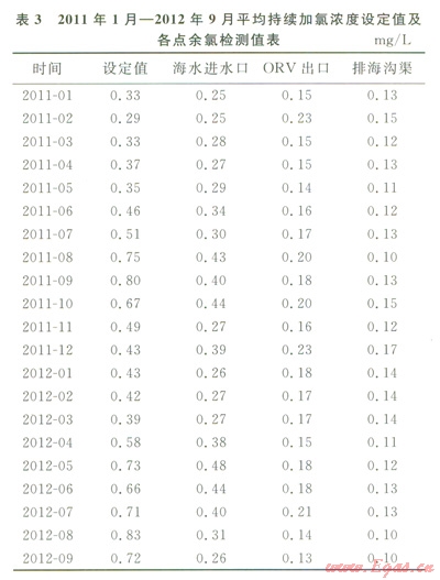 2009年1月至2012年9月,接收站加氯裝置一直連續(xù)運轉(zhuǎn),采用單臺設(shè)備運行的方式,加氯濃度的設(shè)定同時考慮ORV承受能力及外排海水余氯環(huán)保要求。期間平均持續(xù)加氯濃度設(shè)定值及各點余氯檢測值見表2、3。