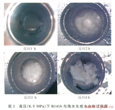 為了考察Rl4lb在深海中(有一定的壓力)與海水生成水合物的過程,筆者選用氮氣作為增加環(huán)境壓力的氣體,主要南于氮氣水合物極難生成。將反應釜的溫度設為2℃,加入240 ml。海水及6mL的R141b,密封反應釜。通入氮氣至壓力為8.5MPa,調(diào)節(jié)攪拌子速率為400r/min,進行水合物生成反應,每小時用相機記錄下水合物反應情況。圖2為觀測到的R14lb水合物生成過程,可以看出,在4h內(nèi)水合物大量生成,遠遠低于在常壓下的反應時間,說明在高壓下R141b可很快地與海水生成水合物。在反應過程中,釜內(nèi)壓力不變,依然為8.5MPa,說明氮氣沒有參與水合物的生成反應。