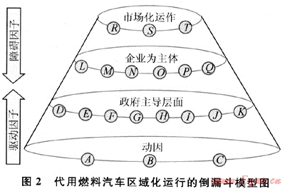 代用燃料汽車的應用推廣是項龐大的系統(tǒng)工程,其區(qū)域化運行呈現(xiàn)明顯的倒漏斗模型,見圖2。