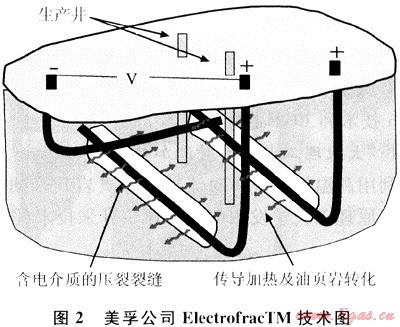 如圖2所示,ElectrofracTM工藝先利用平行水平井對(duì)頁巖層進(jìn)行水力壓裂,向油頁巖礦層的裂縫中填充導(dǎo)電介質(zhì),形成加熱單元。導(dǎo)電介質(zhì)通過傳導(dǎo)把熱量傳遞給頁巖層,使頁巖層內(nèi)的干酪根熱解,產(chǎn)生的油氣通過采油井采到地面上來。同時(shí),伴生礦——碳酸氫鈉也遇熱發(fā)生反應(yīng)生成碳酸鈉,用水抽提出來,作為副產(chǎn)品[9]。