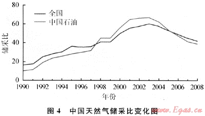 中國的天然氣儲(chǔ)采比在1990年僅為16,后來持續(xù)增長(zhǎng),1998年儲(chǔ)采比首次突破40(為42),2003年達(dá)到最高值(為61,見圖4),隨后因年產(chǎn)量增加而略有下降,2008年為42。中國石油的儲(chǔ)采比從1990年的10增至2003年的67,達(dá)到高峰,隨后下降至2008年的39。2008年中國石化的儲(chǔ)采比為75,中國海油為33。從目前的儲(chǔ)采比來看,中國天然氣產(chǎn)量快速增長(zhǎng)具有較好的儲(chǔ)量基礎(chǔ)。
