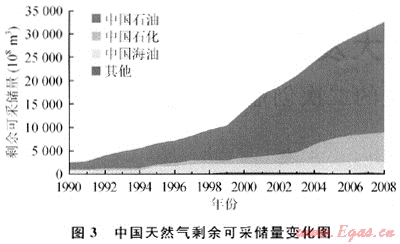 天然氣儲(chǔ)量進(jìn)入新的增長(zhǎng)高峰期。自2000年起,中國平均每年新增天然氣可采儲(chǔ)量3018億立方米,其中中國石油年均新增2238億立方米,占全國平均新增可采儲(chǔ)量的74%(圖2)。截至2008年底,中國累計(jì)探明天然氣可采儲(chǔ)量3.9萬億立方米。白1999年起,中國的天然氣剩余可采儲(chǔ)量快速增長(zhǎng),從1萬億立方米增至2008年的3.2萬億立方米,增長(zhǎng)了2.2倍。截至2008年底,中國石油的剩余可采儲(chǔ)量占全國的74%(圖3)。天然氣儲(chǔ)量的高速增長(zhǎng)支撐了全國天然氣產(chǎn)量的快速提高。