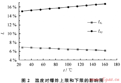 式中LU,t是溫度t時的爆炸上限;LL,t是溫度t時的爆炸下限;LU是t=25℃時的爆炸上限;LL是溫度為t=25℃時的爆炸下限;t為燃氣溫度。