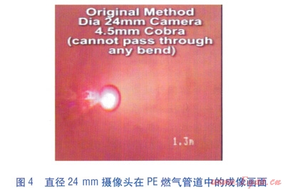 因此,傳統(tǒng)CCTV檢查系統(tǒng)用于PE燃?xì)夤艿纼?nèi)檢測(cè)時(shí),只能針對(duì)含大于90。彎頭的管段或直管段。相對(duì)于較大規(guī)格的攝像頭,直徑為24mm的攝像頭亮度及可視范圍也明顯較弱。直徑分別為24、50mm的攝像頭在PE燃?xì)夤艿乐械某上癞嬅娣謩e見(jiàn)圖4、5。