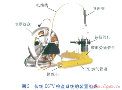傳統(tǒng)CCTV檢查系統(tǒng)的裝置組成見(jiàn)圖2。經(jīng)導(dǎo)向管、轉(zhuǎn)換閥門、鞍形旁通管件后攝像頭進(jìn)入PE燃?xì)夤艿纼?nèi),攝像頭的前進(jìn)動(dòng)力來(lái)自電纜線。電纜線內(nèi)置電源線、影像信號(hào)線、接地線:電源線為攝像頭(包括照明裝置)供電,信號(hào)線把影像傳回顯示器并儲(chǔ)存在儲(chǔ)存器上,接地線為防止攝像頭移動(dòng)過(guò)程中出現(xiàn)放電現(xiàn)象。攝像頭、電纜線均采用防水、防爆設(shè)計(jì),既不會(huì)因觸水而損毀,也不會(huì)引起燃?xì)獗肌?span lang="EN-US">
