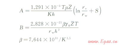 式中PR為地層壓力,MPa;Pwf為井底流壓,MPa;A、B為二項(xiàng)式系數(shù);qsc為日產(chǎn)氣量,m3/d;T為地層溫度,K;`m為平均黏度,mPa·S;`Z為平均偏差因子;K為絕對(duì)滲透率,mD;h為地層有效厚度,m;re為供給半徑,m;rw為井底半徑,m;S為表皮系數(shù);b為湍流引起的慣性阻力系數(shù);ge為天然氣的相對(duì)密度。