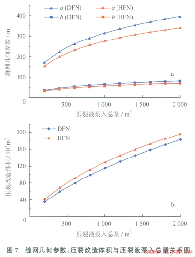 DFN模型和HFN模型計(jì)算所得縫網(wǎng)最大縫高分別為27.9m和27.2m,不隨壓裂液泵入總量的變化而變化。在其他條件相同的情況下,隨著壓裂液泵入總量的增大,a和b逐漸增大,壓裂改造體積逐漸增大;對(duì)于DFN模型,a由l71m增加至395m,b由34m增大至79m,壓裂改造體積由34×104m3增大至183×104m3;對(duì)于HFN模型,以由153m增加至340m,b由31m增大至68m,壓裂改造體積由40×104m3增大至l97×l04m3;在泵入相同體積壓裂液的情況下,利用DFN模型計(jì)算的縫網(wǎng)幾何參數(shù)比HFN模型計(jì)算值大(圖7-a);而利用DFN模型計(jì)算的壓裂改造體積比HFN模型計(jì)算值小(圖7-b)。
