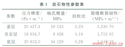 A井垂深2380m,水平井段長(zhǎng)l828m,目標(biāo)頁(yè)巖層在2370~2397m,層厚27m,基質(zhì)滲透率為0.002mD,各層巖石物性參數(shù)如表1所示;本井共進(jìn)表1巖石物性參數(shù)表行了七級(jí)清水壓裂,每一級(jí)有5簇射孔段,每一簇含8個(gè)射孔孔眼;選擇100目石英砂作為支撐劑,假設(shè)支撐劑在所有裂縫中均勻分布,沉降速率為1.27mm/min。兩個(gè)模型均假設(shè)縫網(wǎng)由兩簇分別垂直于最大、最小水平主應(yīng)力的垂直縫組成,不含水平縫。