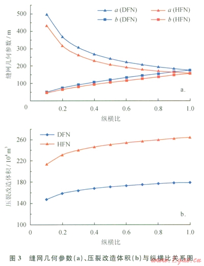 DFN模型和HFN模型計(jì)算所得縫網(wǎng)最大縫高分別為27.9m和27.2m,不隨縱橫比的變化而變化。在相同壓裂施工條件下,隨著縱橫比的增大,a逐漸降低,b逐漸增大,壓裂改造體積逐漸增大;對(duì)于DFN模型,a由500m降低至l76m,b由50m增大至l76m,壓裂改造體積由l47×104m3增大至179×l04m3;對(duì)于HFN模型,a由435m降低至158m,b由43.5m增大至158m,壓裂改造體積由214×104m3增大至264×104m3。在相同縱橫比下,利用DFN模型計(jì)算的縫網(wǎng)幾何參數(shù)比HFN計(jì)算值大(圖3-a);而利用DFN模型計(jì)算的壓裂改造體積比HFN模型計(jì)算值小(圖3-b)。
